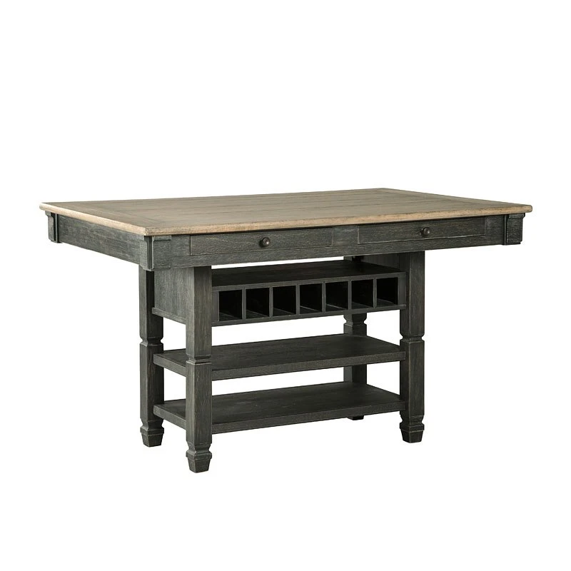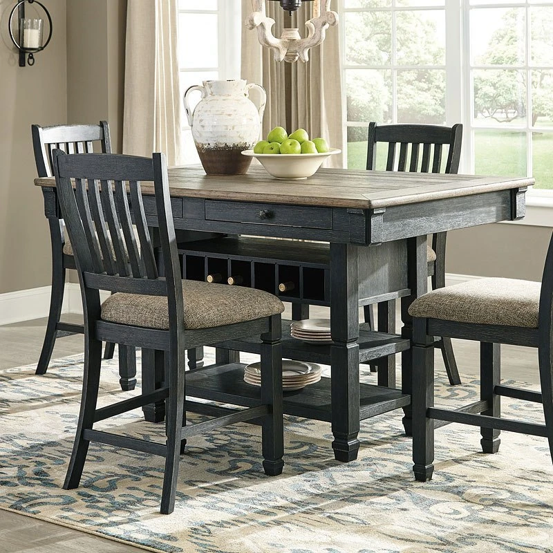 Invite your family into the heart of your home with the Tyler Creek Counter Height Table by Signature Design. The black finish is beautifully textured. Timeworn planked oak top creates a unique two-tone contrast. Base provides plenty of storage for wine bottles and other essentials. Put away smaller items in the drawers. This is trend-right urban farmhouse style.