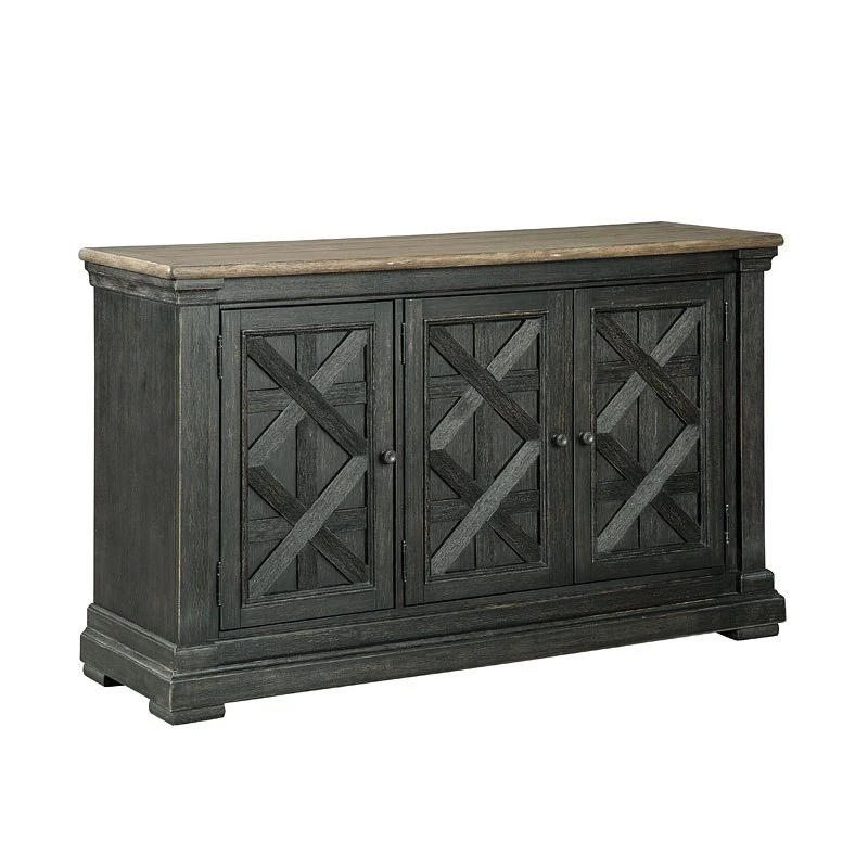 - OverviewInvite your family into the heart of your home with the Tyler Creek Server by Signature Design. The black finish is beautifully textured. Timeworn planked oak top creates a unique two-tone contrast. Charming lattice design graces the front of the doors. Store away essentials on the cabinet shelving. Thick pilasters add to the sturdiness of the foundation. This is trend-right urban farmhouse style.