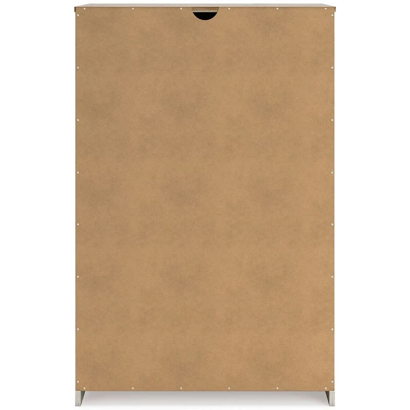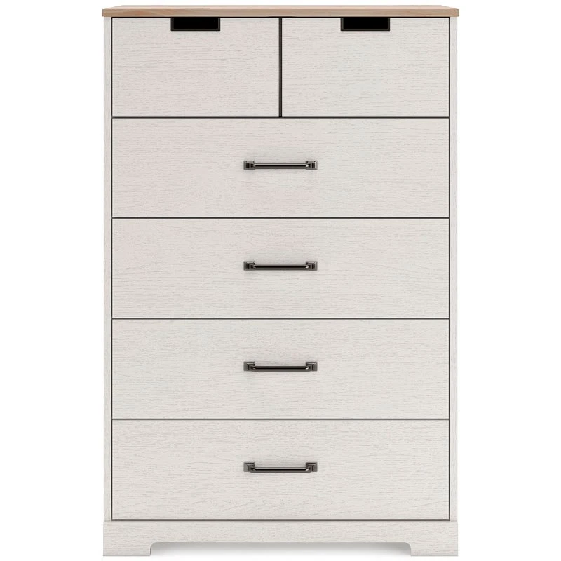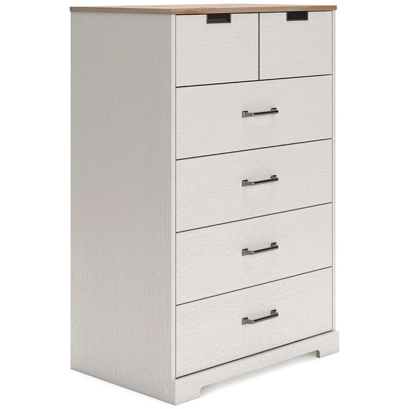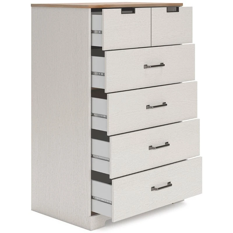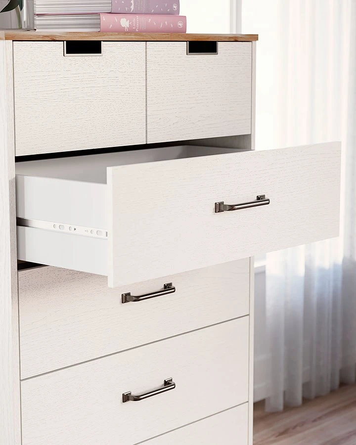 - OverviewFresh and inviting, this Vaibryn chest of drawers by Signature Design is truly versatile. A crisp white painted finish with a subtle replicated wood grain brings light to your room, while a warm brown finish accents the top. Design details include metal cut-out openings along the upper drawer, with the lower drawers paired with metal handles in an antiqued nickel-tone finish. Five smooth-gliding drawers provide plenty of storage, so there’s no excuse for a messy room.