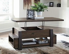 - OverviewA table with form and function, and a whole lot of style, is what the Vailbry lift-top cocktail table by Signature Design is all about. Its handy lift-top, open lower shelf and signature side shelves offer lots of convenient spots to keep the room’s necessities. The distressed brown finish contrasts beautifully with the dark brown faux metal finished legs for a floating top look that’s striking – quite a value for a style that will withstand the test of time.