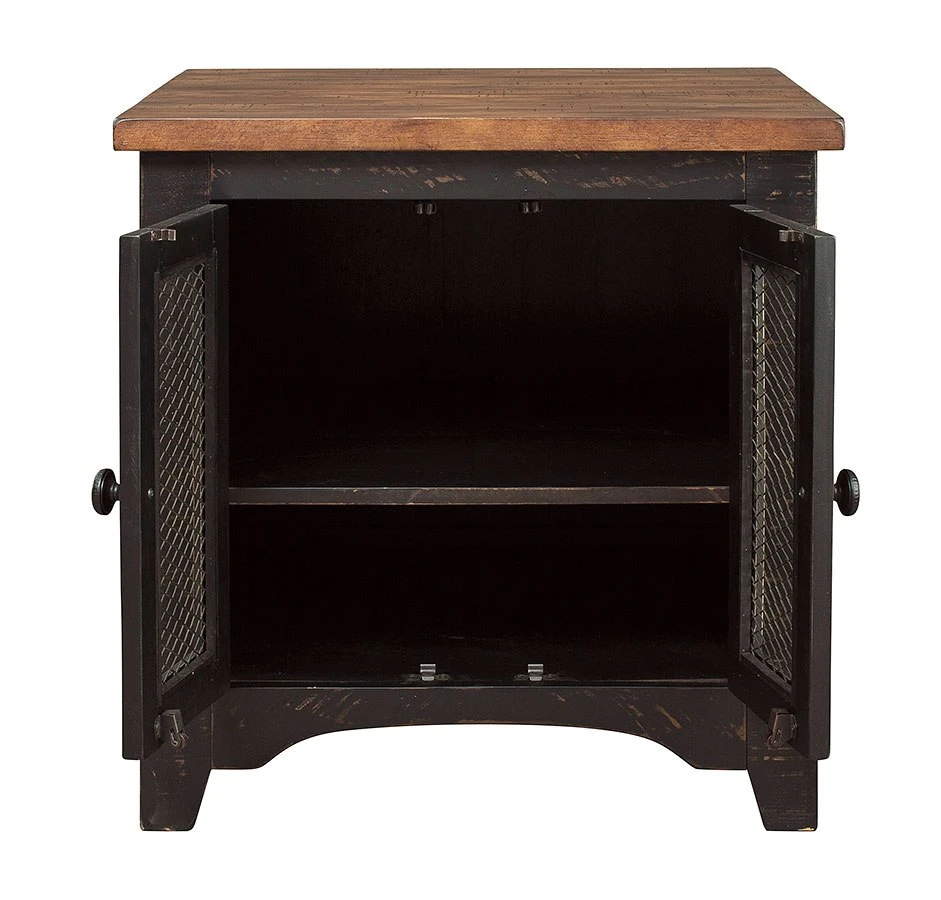 - OverviewTo those with an eye for the best in rustic farmhouse living, the two-tone Valebeck Occasional Table Set by Signature Design doubles up on form and function. Clever split style design pairs a spring lift top with hinged lid revealing a handy storage compartment. Designer touches include plank-effect styling, distress marks and industrial brackets for added character.