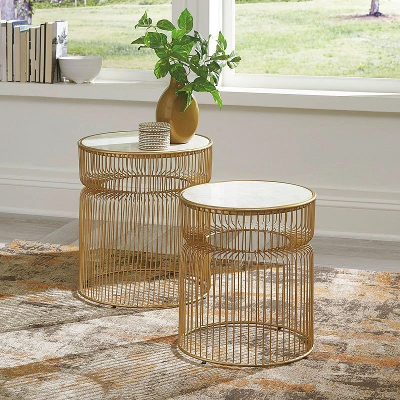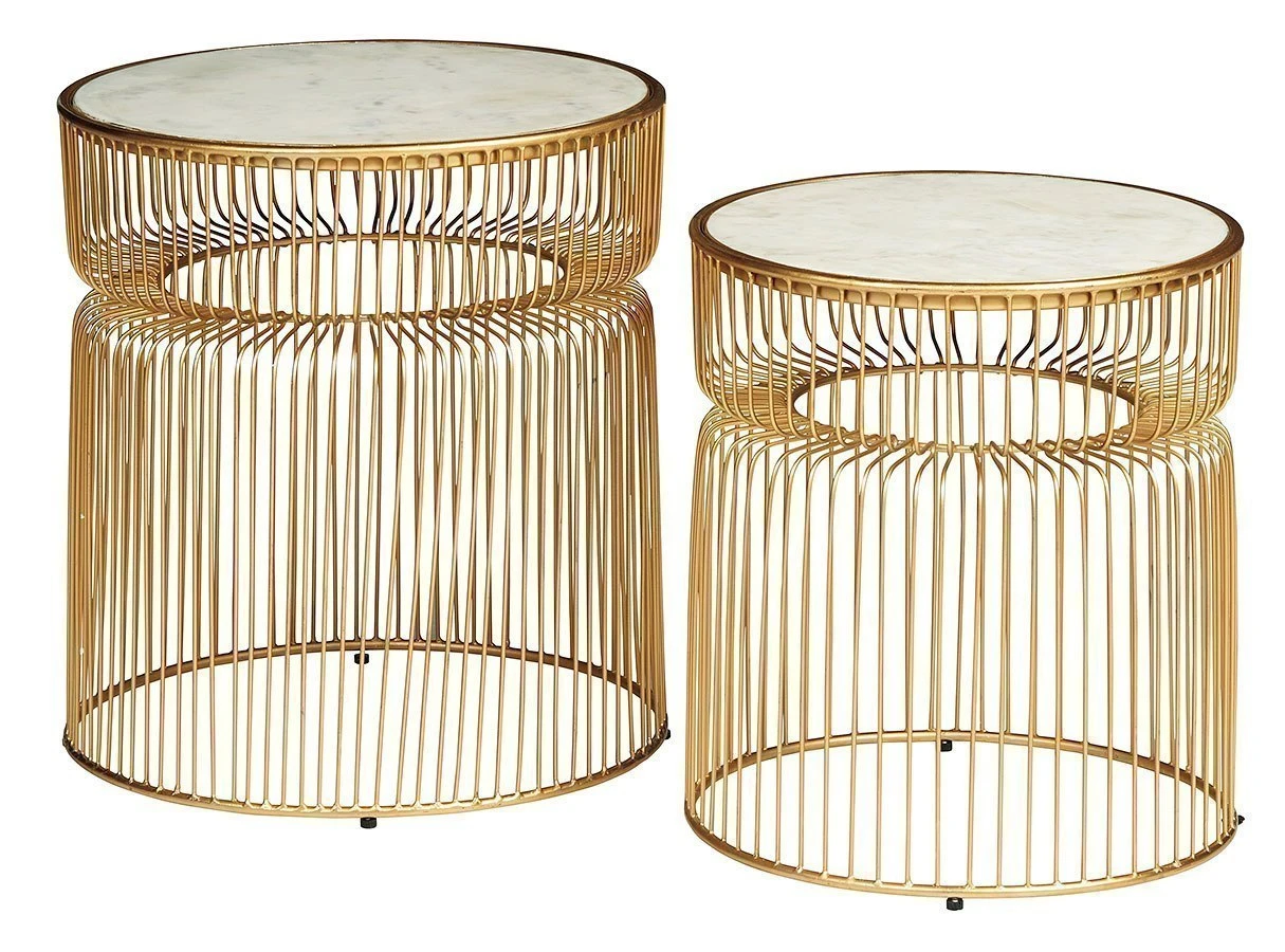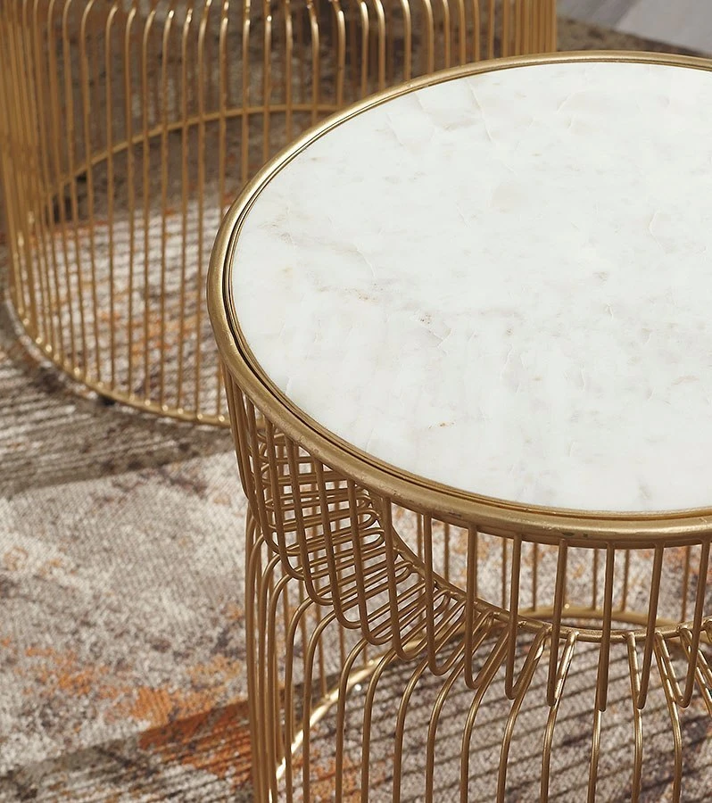 - OverviewMake way for less-is-more design with this accent table set. Sculptural goldtone metal base complements the open-and-airy look you’re going for. White marble tabletop is as posh as it is practical.
