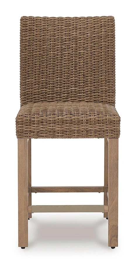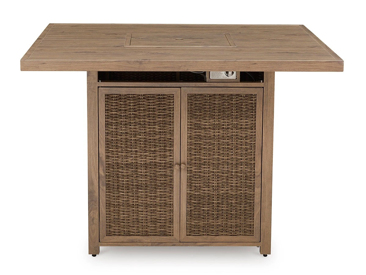 - OverviewA perfect balance of design and utility, this Walton Bridge Outdoor Fire Pit Bar Table Set by Signature Design turns any outdoor living space into your own piece of paradise. Crafted with easy-care resin wicker over an aluminum frame with the look of wood, it’s the epitome of California dreamin’ style. The press of a button ignites a flickering flame that dances over a bed of glass beads. And with room for up to eight, it’s one highly accommodating table.