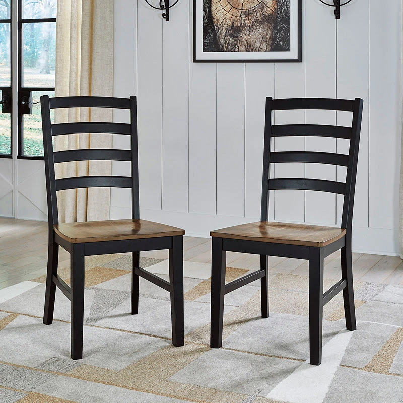 - OverviewRaise the bar on modern farmhouse style with this Wildenauer Side Chair by Signature Design. Its casual good looks are accentuated with a handsome two-tone finish. A clean-lined silhouette with a modern ladderback design adds a fresh element, whether your style is vintage, country or eclectic. This richly crafted seating option serves up charm wherever folks decide to take a seat.