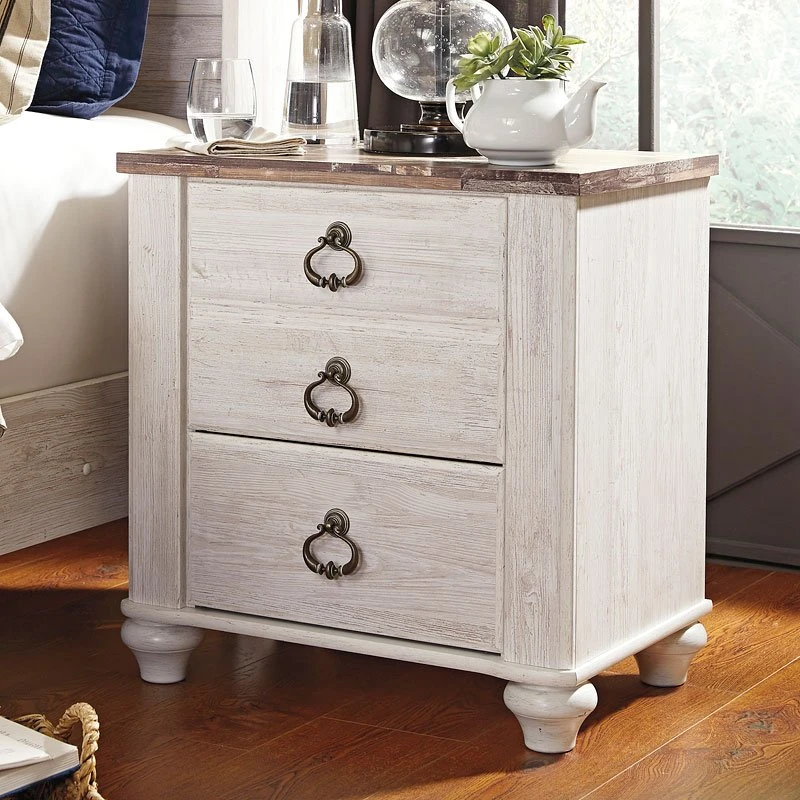 - OverviewThe Willowton Bedroom Collection by Signature Design is the ultimate statement group for your coastal cottage or shabby chic inspired retreat. Whitewashed finish on the pieces is wonderfully easy on the eyes. Paired with the unique plank-style tops, it’s a driftwoody look that has our minds drifting away to beachy-keen escapes.