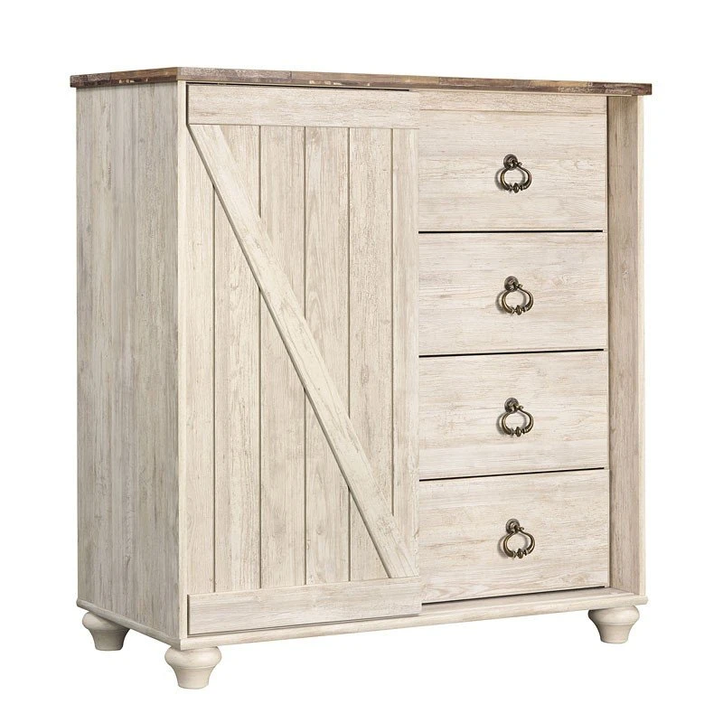 - OverviewThe Willowton Dressing Chest by Signature Design is the ultimate statement piece for a coastal cottage or shabby chic inspired retreat. Whitewashed finish on the drawers and sides is wonderfully easy on the eyes. Paired with the unique plank-style top, it’s a driftwoody look that has our minds drifting away to beachy-keen escapes.