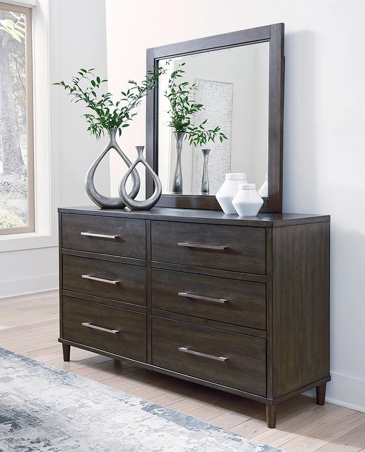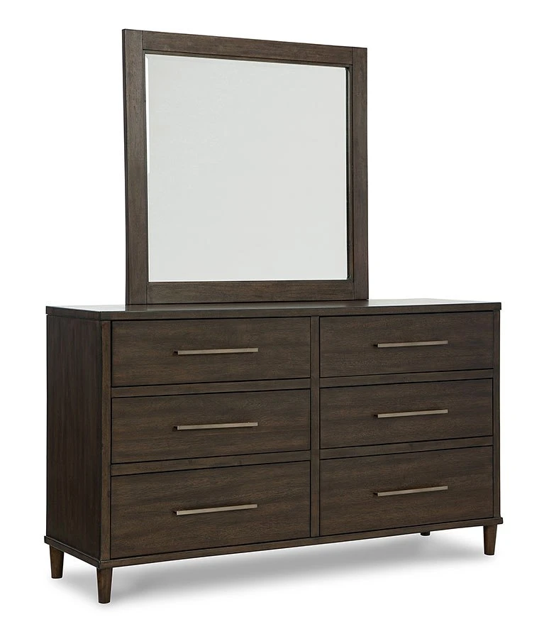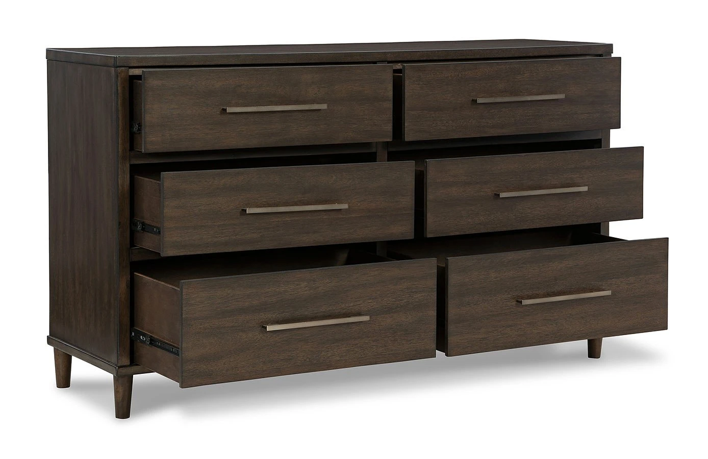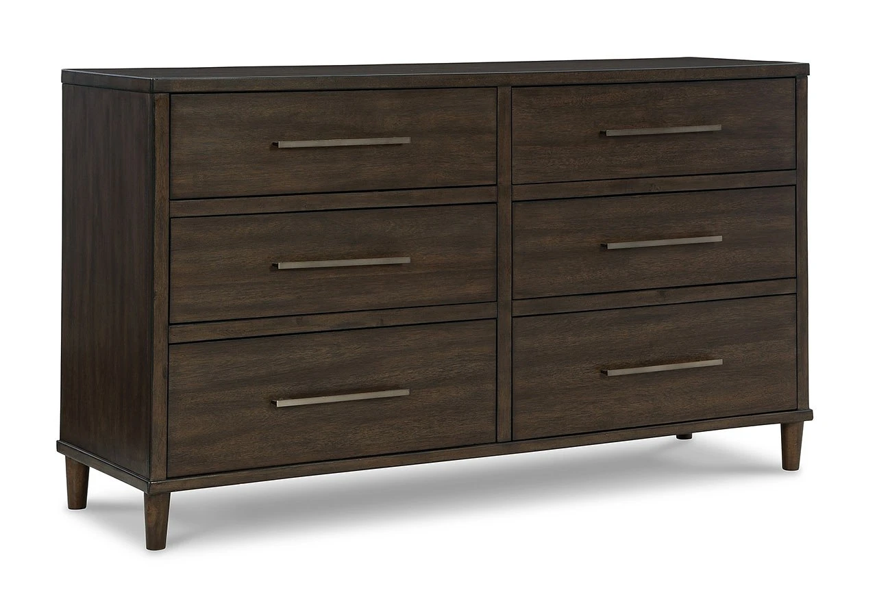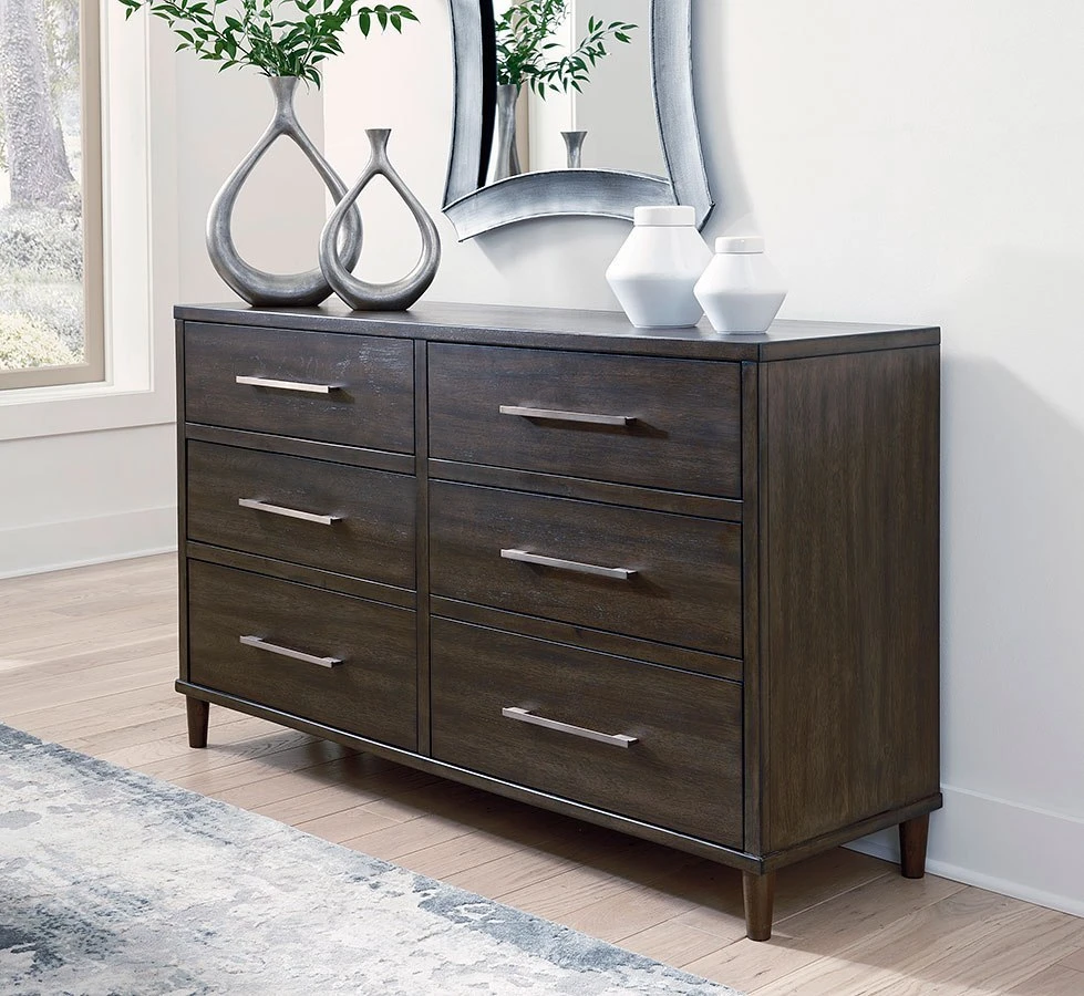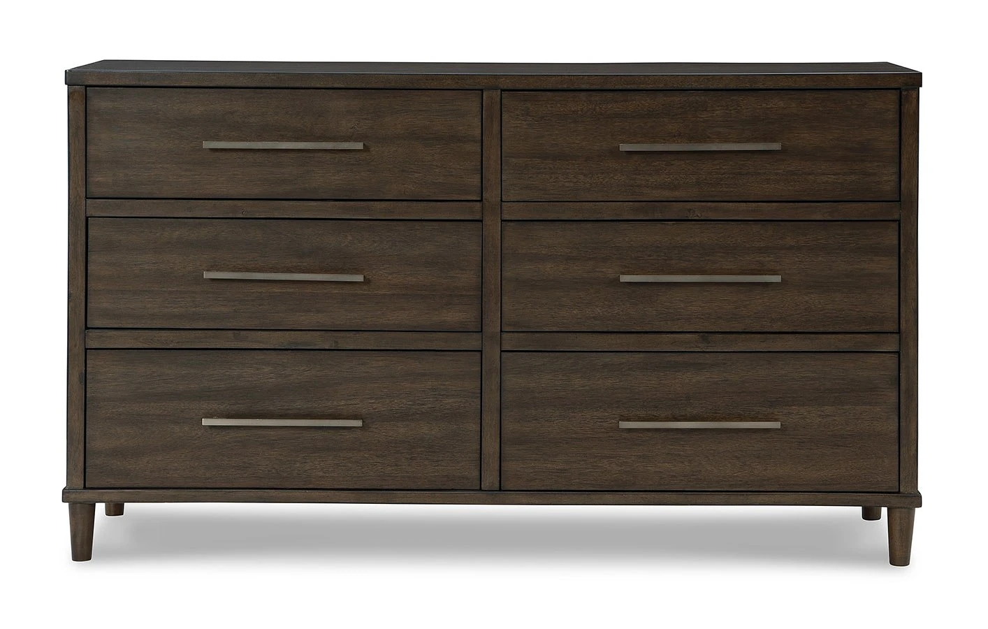 - OverviewFor fans of an uncomplicated mid-century modern vibe, this Wittland dresser by Signature Design clearly steals the show. Its finish balances a rich, warm brown undertone with a hint of gray for a contemporary aesthetic with wonderful character. Linear large-scale pulls pull it all together. Six smooth-gliding drawers with dovetail construction meld quality, form and function.