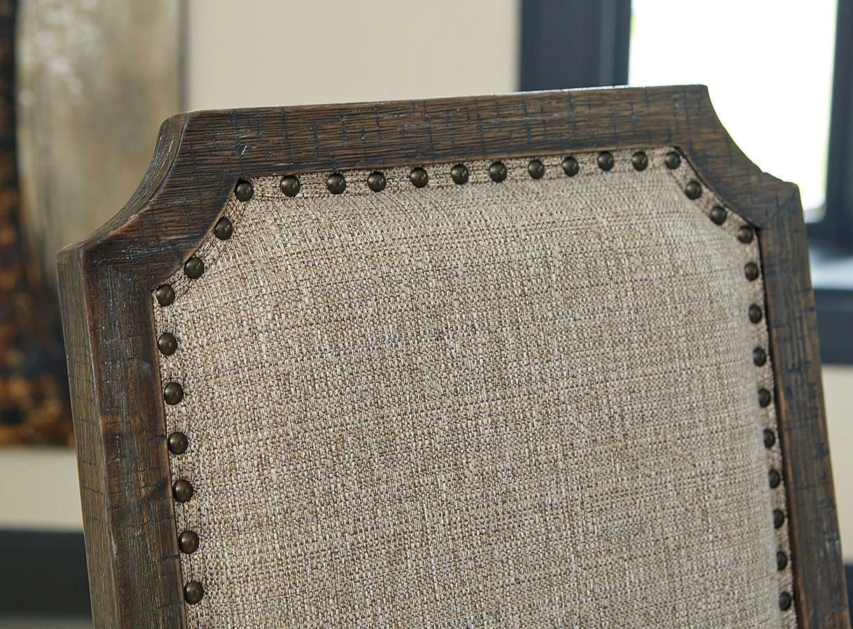 - OverviewInspired by heavy and hearty lodge-style furnishings from days gone by, the Wyndahl dining room upholstered chair by Signature Design brings the past brilliantly into the present. Enticing with a distressed aged pine color finish with light wire-brushed texture, this richly styled dining chair with bent slat design and textural beige upholstery is reserved for those who appreciate furniture with great presence.