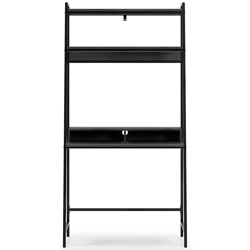 - OverviewElevate your home office with this simply sensational Yarlow desk and shelf by Signature Design. Pairing a dark wood grain look with a black metal frame for modern appeal, this minimalistic desk provides a convenient work surface with incorporated cubby shelves (with cutout for wire management) and two upper shelves for extra storage and display space. Its open-concept design, sleek aesthetic and build-in charging ports help you make the most of small space living.