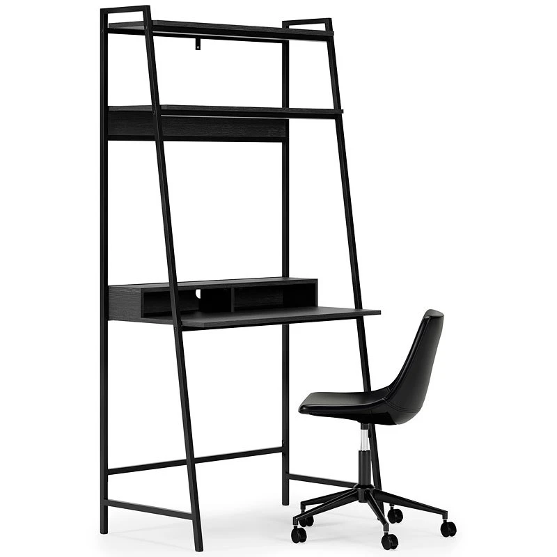 - OverviewElevate your home office with this simply sensational Yarlow desk and shelf by Signature Design. Pairing a dark wood grain look with a black metal frame for modern appeal, this minimalistic desk provides a convenient work surface with incorporated cubby shelves (with cutout for wire management) and two upper shelves for extra storage and display space. Its open-concept design, sleek aesthetic and build-in charging ports help you make the most of small space living.