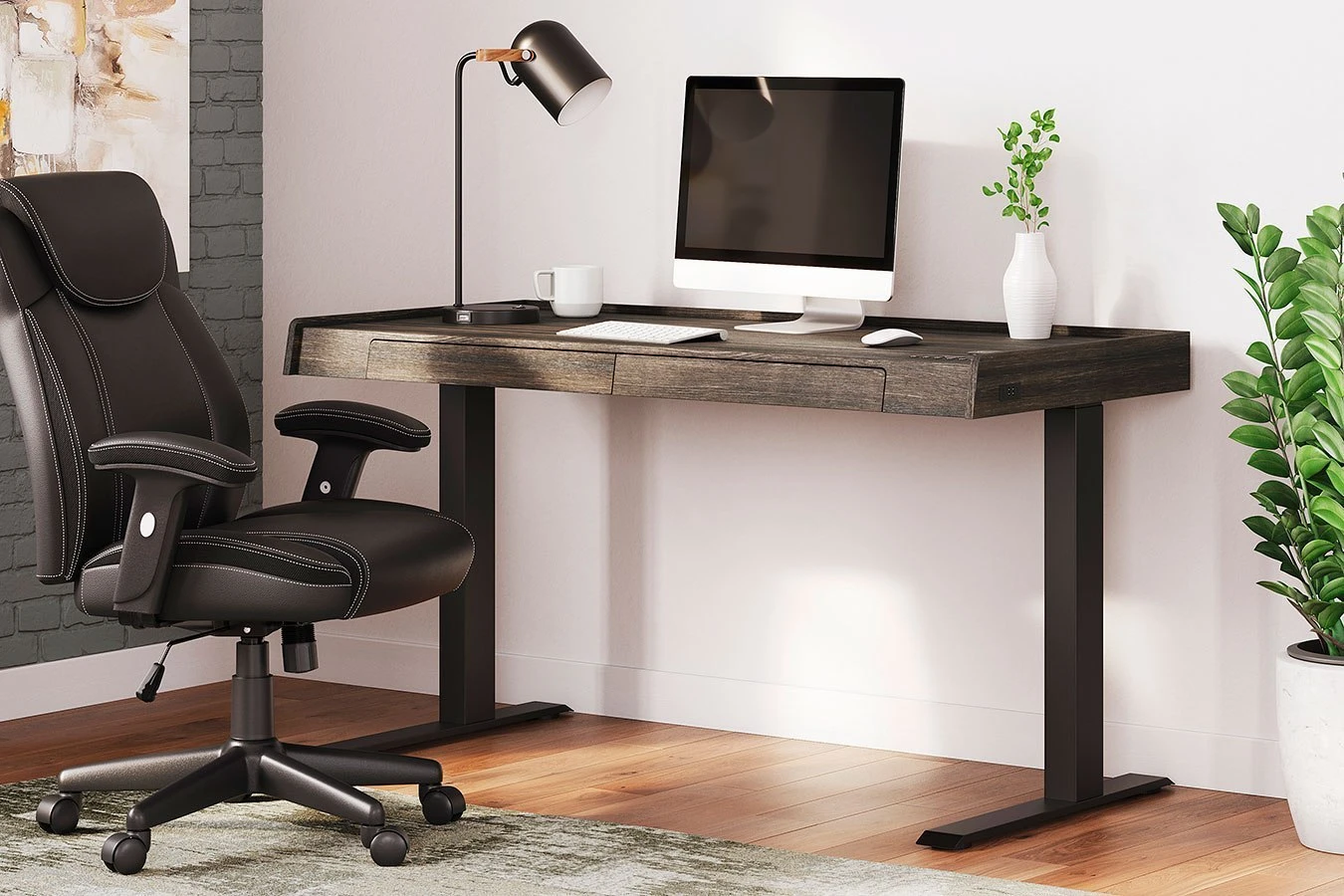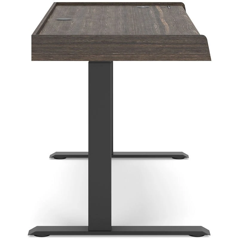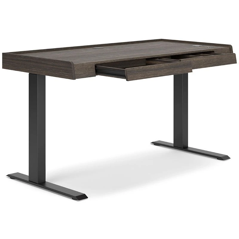 - OverviewCraft a decidedly modern home office with this Zendex adjustable height desk by Signature Design. Its rich dark brown wood grain pattern has an air of refinement, while the two drawers keep workspace essentials organized in sleek style. Programmable height positions – along with USB, USB-C and wireless charging – round out this clean-lined, contemporary piece.
